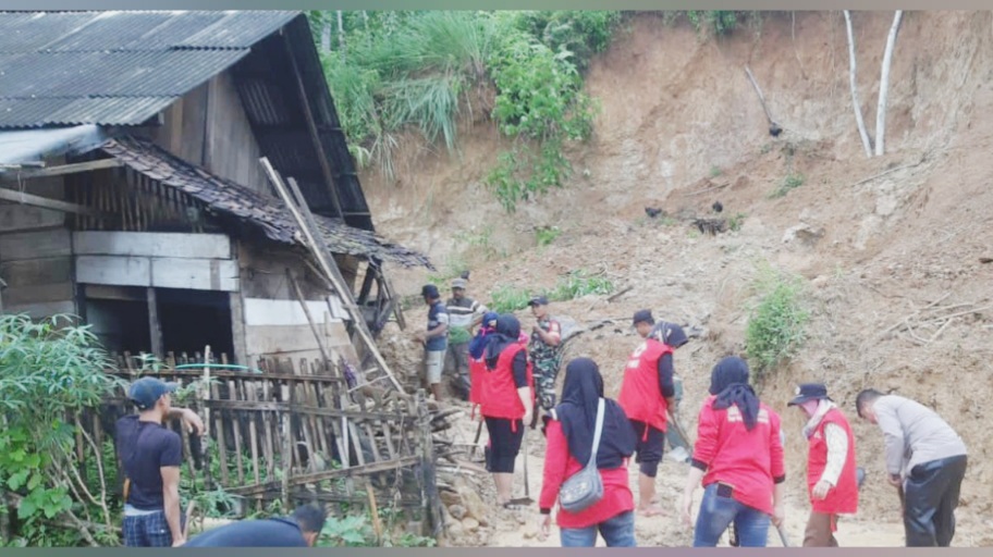 Tanggamus.Lappung.COM – Jajaran Polsek Semaka, TNI dan warga gotong royong membantu membersihkan rumah warga yang tertimbun tanah longsor di Pekon Sedayu.